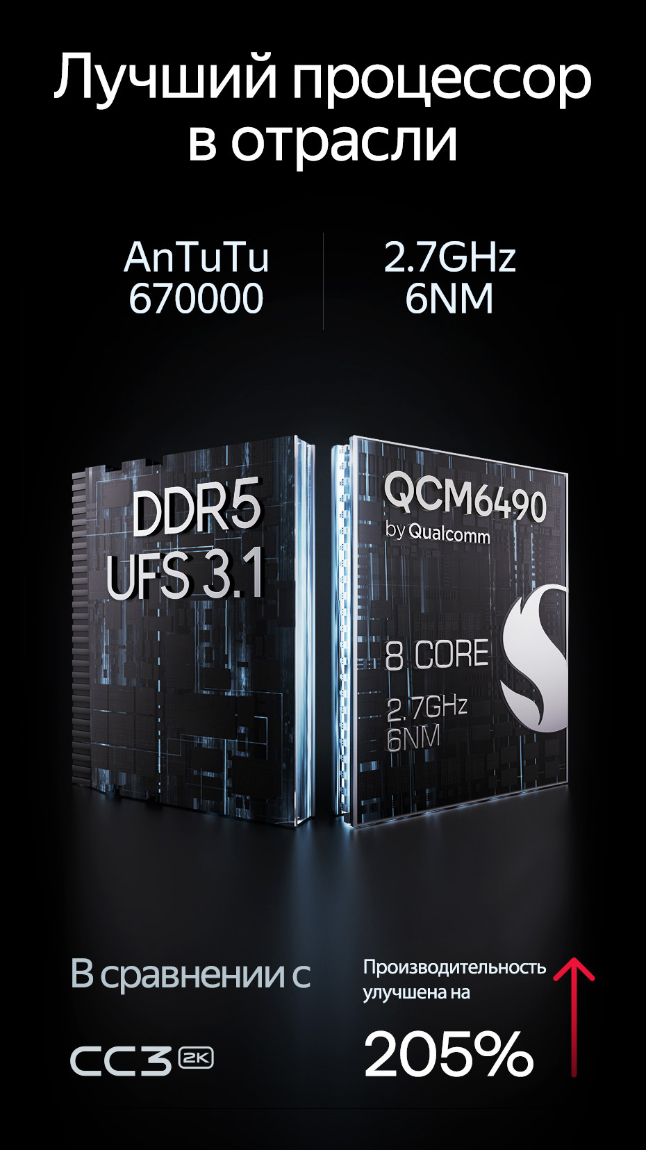 Процесор: 8-ядерний QCM6490 (1*A78 2,7 ГГц + 3*A78 2,4 ГГц + 4*A55 1,9 ГГц)